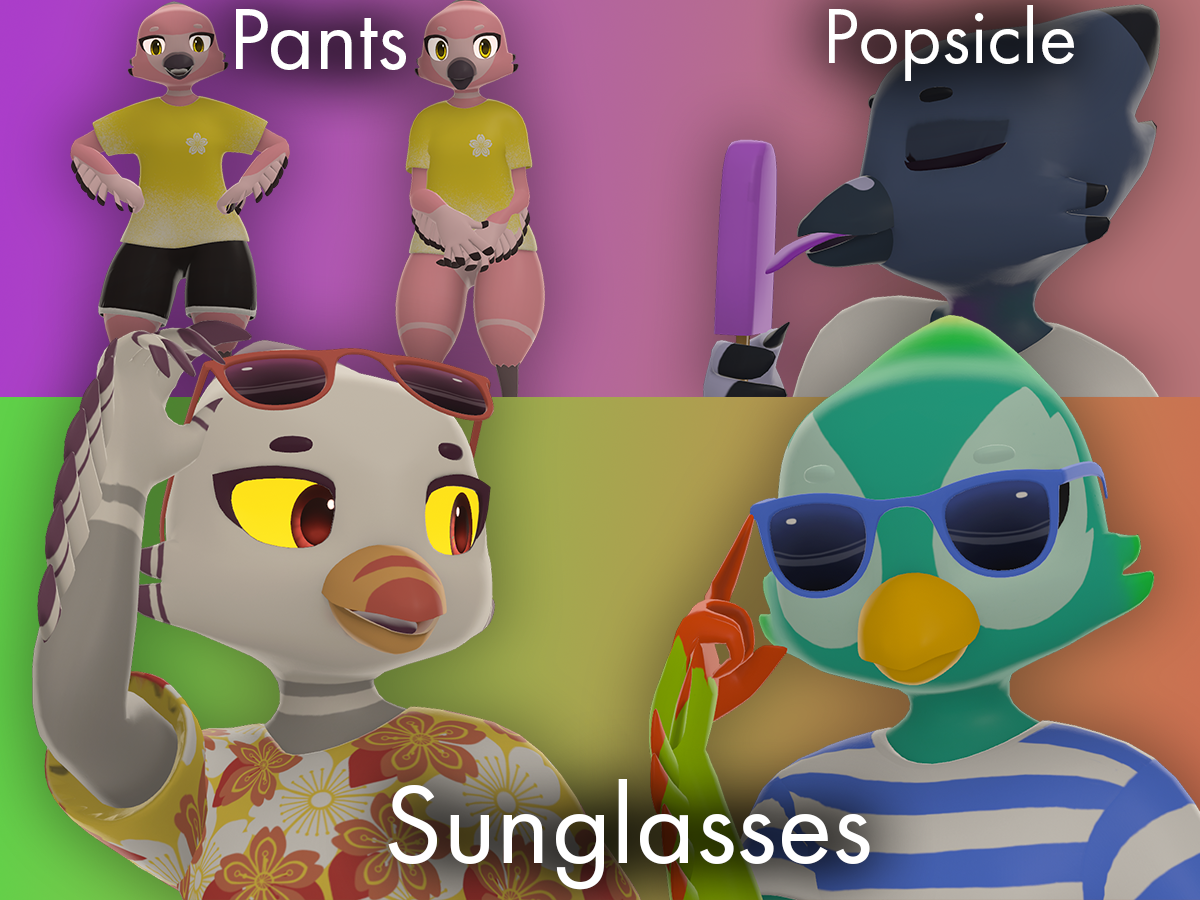 - Toggle-able Sunglasses, Pants, Wings, Tongue, and Popsicle